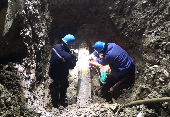 針對管內水位居高不下,搶修人員集思廣益,反復論證,決定采用管道上方“開天窗”和下方加設排水管的方案進行施工,大家各司其職,一邊用膠泥堵塞管道兩側來水,一邊見縫插針一點一點對焊縫進行補焊。管道泄漏的水呈扇狀大量噴出,不一會兒大家的衣褲被淋濕透,為了搶時間,現場沒有一個人臨陣退卻。在業主方生技部等部門的積極配合下,經過36小時連續作戰,順利完成堵漏焊補,有效避免了因泄漏造成水源流失的大量浪費,保證了生產現場機組設備消防水的安全供應。