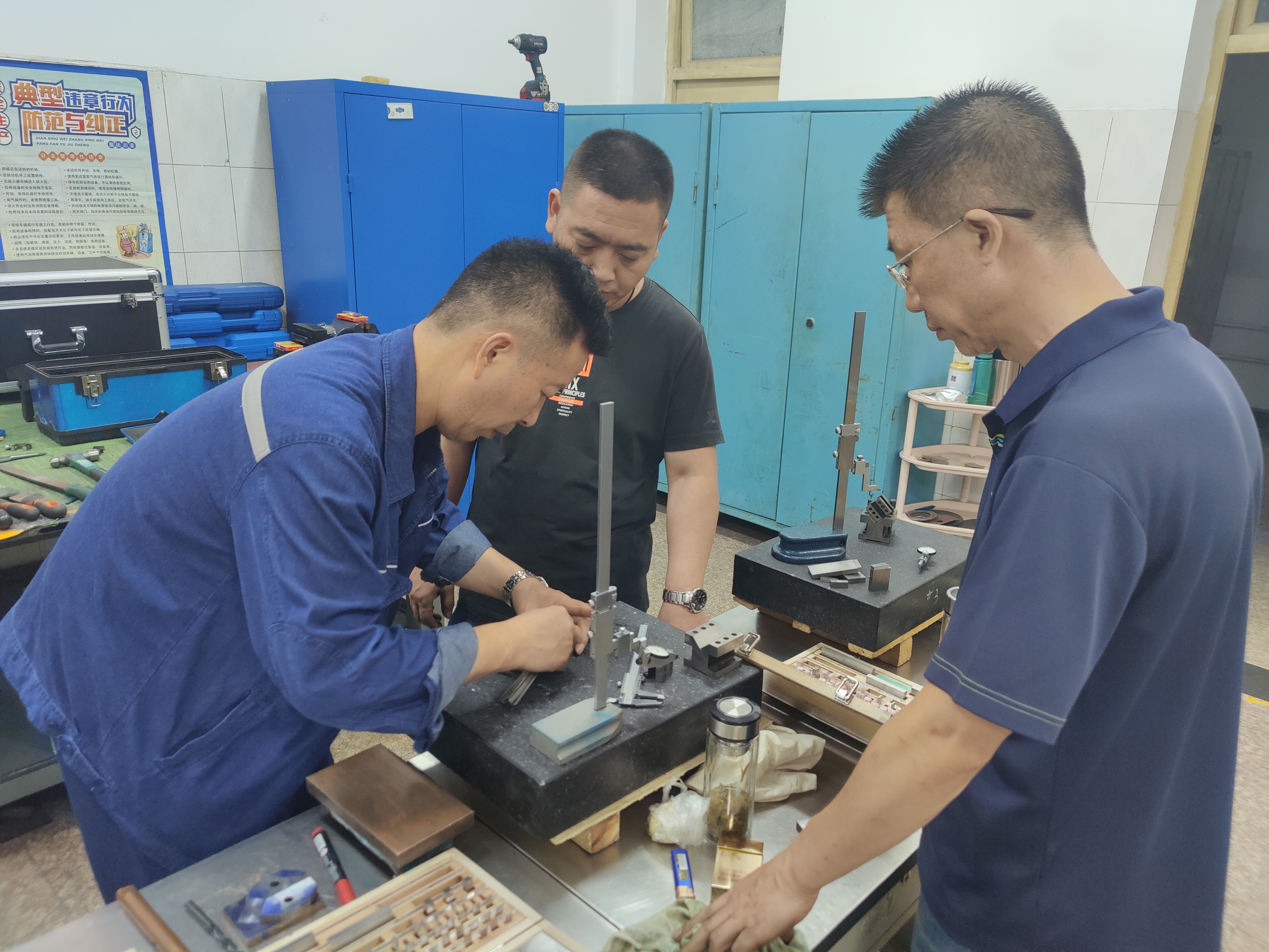 鉗工組選手主動放棄期休息時間,加班加點進行訓練。指導老師針對不同工種,一對一、面對面,示范講解工件加工到0.005mm精度的操作方法,并逐一剖析參賽選手的不足,幫助選手掌握操作技巧。待晚上走出訓練室時,大家全身早已全部被汗水打濕,白色的工作服也被染成了鐵銹色。