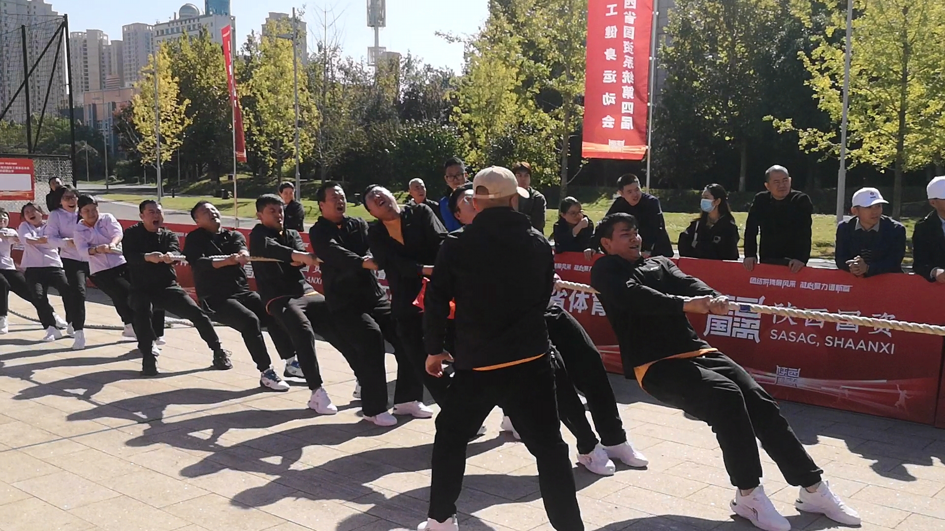 力的較量,心的凝聚。10月21日至22日,省國資系統第四屆職工健身運動會拔河比賽項目在陜西奧體中心體育館廣場拉開帷幕。本項比賽匯聚了來自全省各行各業的15支代表隊參加,公司選派16名選手代表集團出戰。
