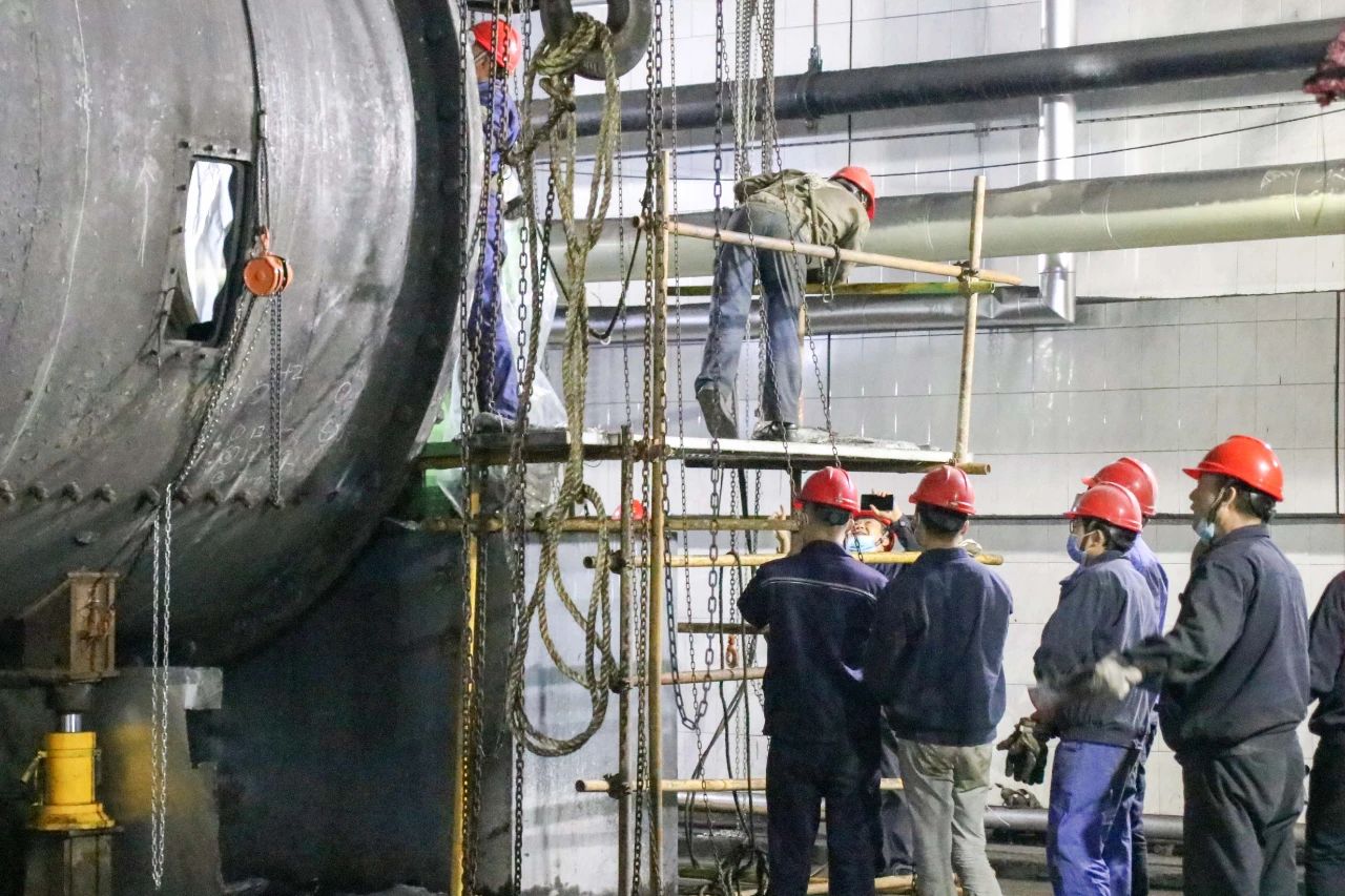 截止目前,經(jīng)過(guò)全體人員7個(gè)晝夜的奮戰(zhàn),鉗工、焊工、起重工多工種的緊密配合,磨煤機(jī)罐體已頂起,端蓋拆除工作正在緊張有序地進(jìn)行。