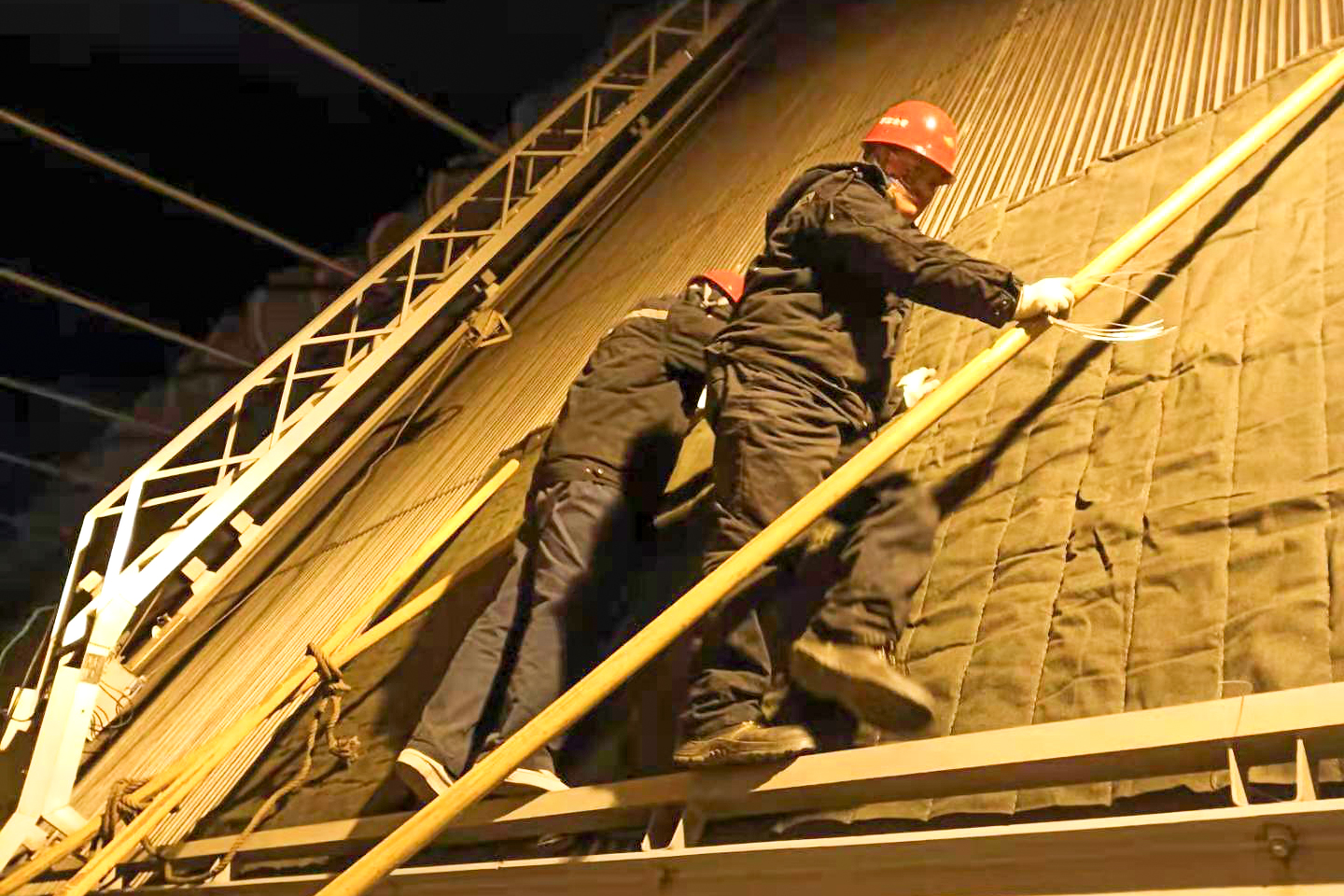 近日,陜北地區迎來入冬以來極寒天氣,氣溫驟降至零下25℃,趙石畔煤電#2機組間冷塔冷卻三角散熱管束突然凍裂泄漏。為確保保證機組安全運行,趙石畔項目部立即組織人員投入泄漏管束隔離堵板的加裝工作。間冷塔頂部平臺上,項目部工作人員迎著呼嘯的寒風,全力投入搶修工作。工作中,實在冷得堅持不住時,大家就將提前準備好的棉被裹在身上,繼續艱難地開展工作。中午,全體人員主動放棄休息,簡單地吃過飯后,又立即投入工作。經過三天兩夜的奮戰,圓滿完成了間冷塔堵板的加裝工作。